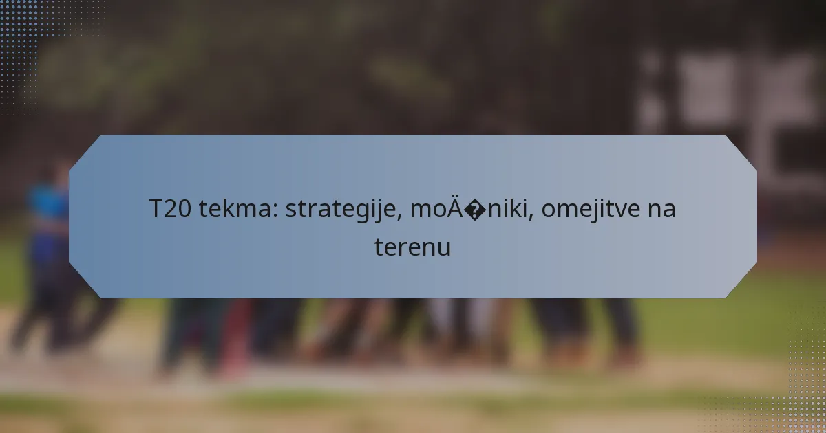T20 tekme zahtevajo inovativne strategije, ki se osredotočajo na maksimiranje točk, hkrati pa omejujejo možnosti za dosego točk nasprotnika. Ključni elementi, kot so powerplayi in omejitve na terenu, igrajo odločilno vlogo pri oblikovanju taktik, ki jih uporabljajo ekipe, kar vpliva na pristop k udarjanju in metanju skozi celotno igro.